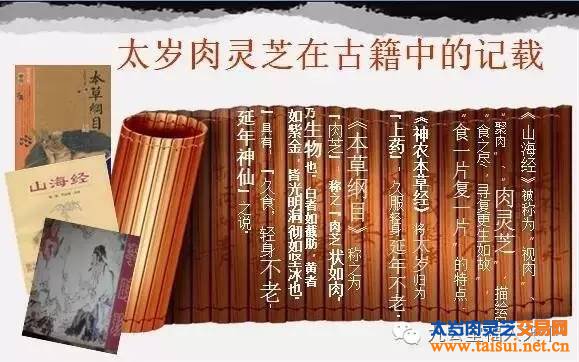 作《抱朴子》中记载“肉灵芝,又称太岁。”“诸之捣末,或化水服,令人轻身长生不老。”